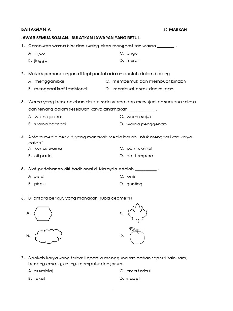 Koleksi Soalan Peperiksaan Sijil Pelajaran Malaysia SPM 2020 2021 2022 ini adalah alat latihan untuk mempersiapkan diri untuk Peperiksaan SPM untuk mendapatkan gred yang baik. Dibawah ini admin telah kongsikan soalan bahasa melayu tahun 1 ujian 1 bulan mac. Soalan Akhir Tahun Pendidikan Seni Visual Tahun 5 adalah antara bahan-bahan terbaik yang kami adaBahan yang terdapat di sini memenuhi keperluan Pentaksiran Berasaskan Sekolah yang dilaksanakan secara menyeluruh mengikut prinsip bahawa semua mata pelajaran yang terkandung dalam KSSR memainkan peranan yang penting bagi memenuhi keperluan.